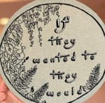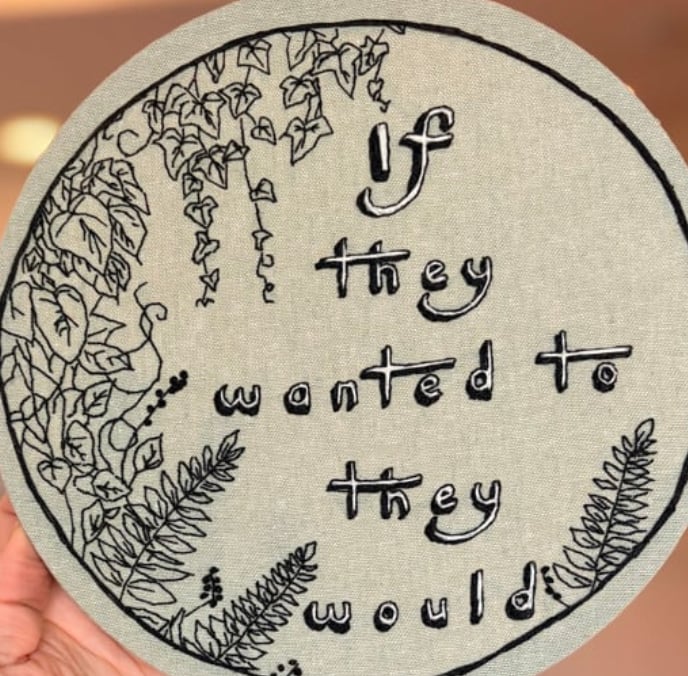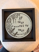 9 inch hoop, framed in a 12 x12 painted black frame. Cotton & linen blend fabric with DMC cotton thread. Signed & dated.
