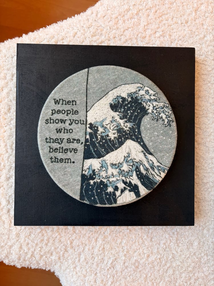 Framed fabric print of original hand embroidery design. 6 inch hoop mounted on 8x8 painted wooden frame.