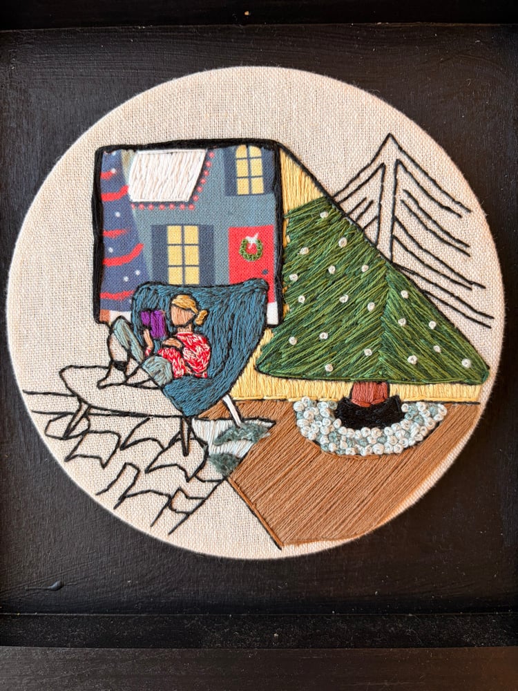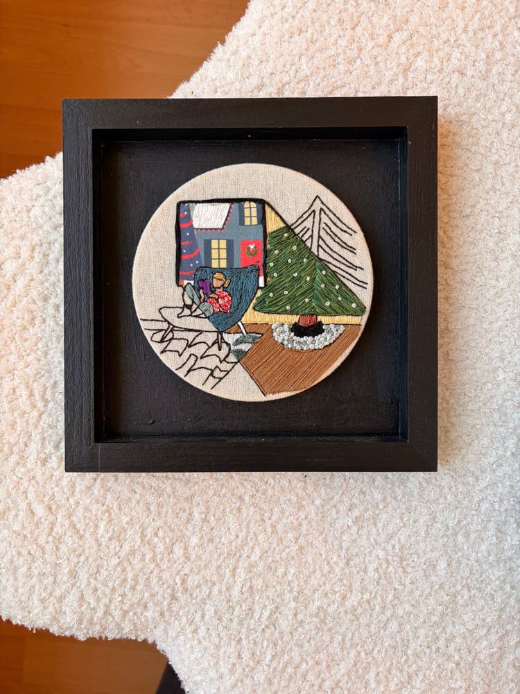 Original hand embroidery in 6 inch hoop, mounted on 8x8 painted black frame. Signed & dated.