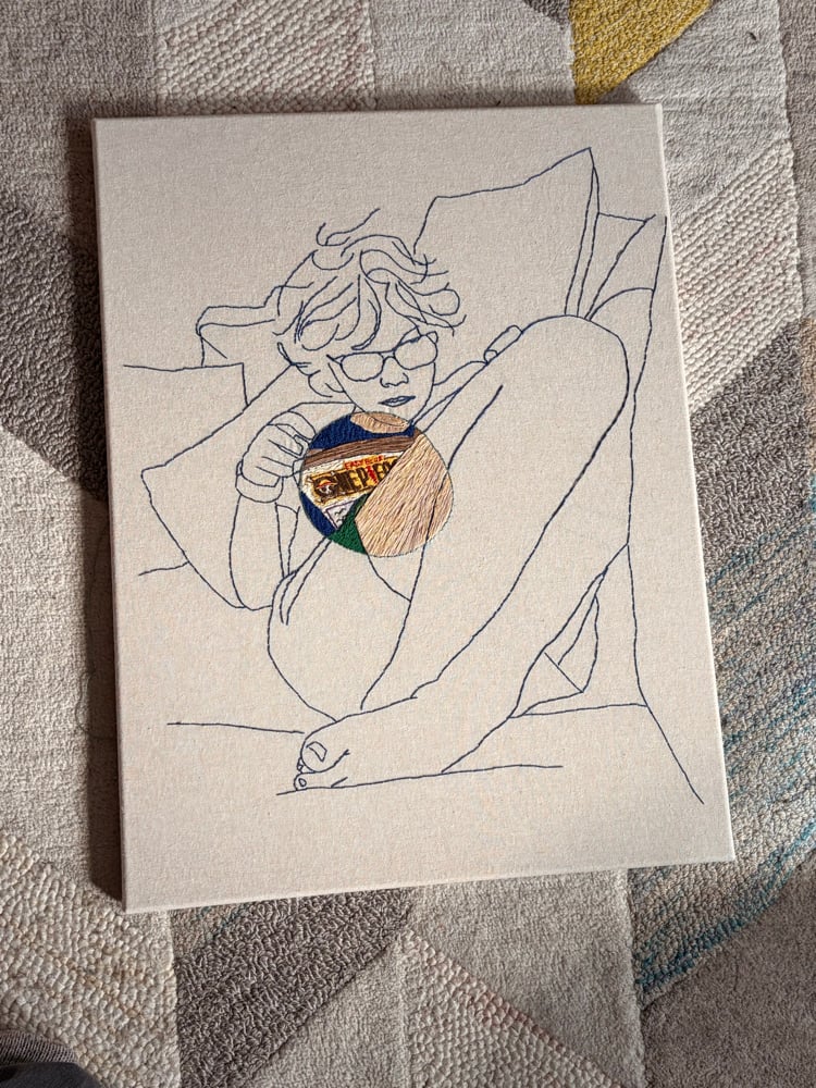 18” x 24” Stretched cotton linen blend with DMC cotton thread.