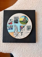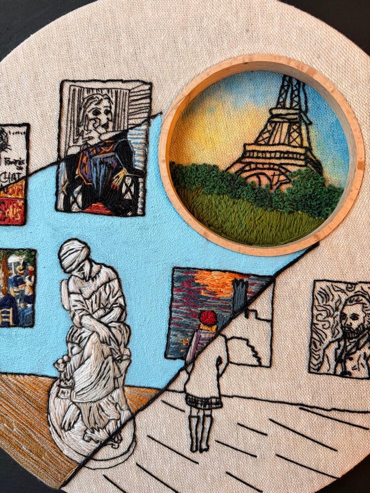 Original hand embroidery in a 9 inch hoop with a 3 inch double hoop. DMC cotton thread on a cotton/linen blend fabric. Framed on a 12 x 12 painted wooden frame.