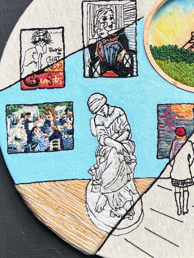 Original hand embroidery in a 9 inch hoop with a 3 inch double hoop. DMC cotton thread on a cotton/linen blend fabric.
